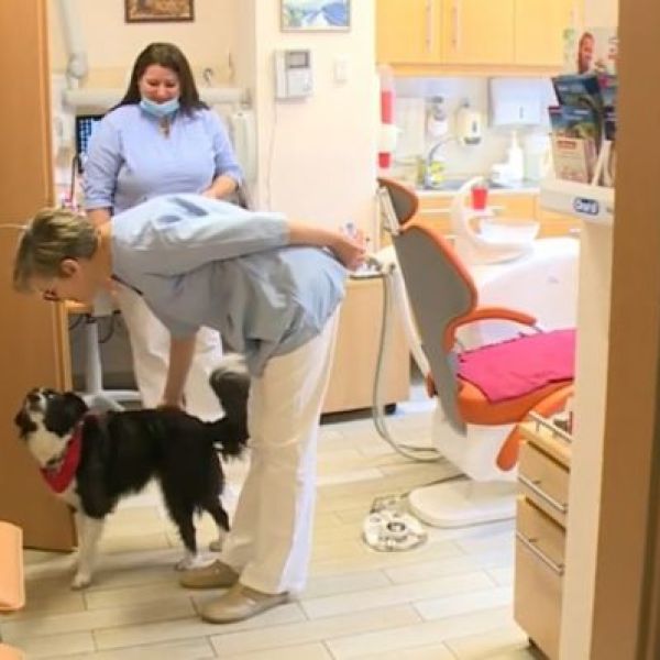 Pacsival üdvözli a kezelésre érkezőket egy egri fogászati rendelőben Lara, a terápiás kutya. Az 5 éves border collietöbb tanfolyamot követően, 2019 óta segíti a gazdája és a rendelő munkáját azzal, hogy oldja a páciensek feszültségét – számolt be a TV Eger.