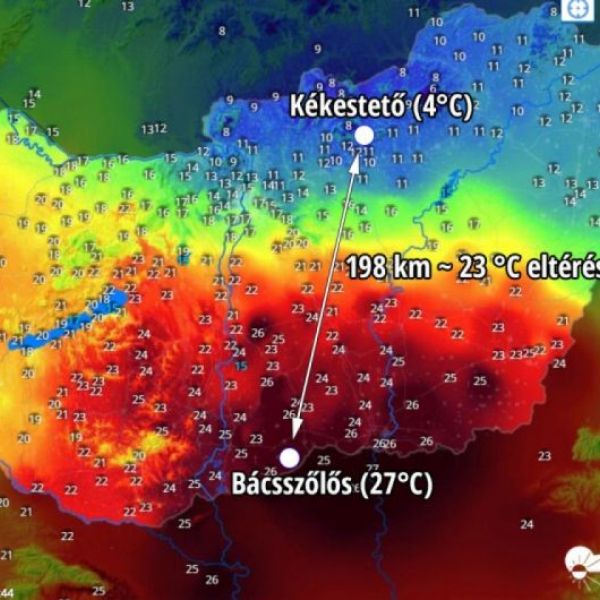 Kékestetőn alig több mint 4 fokot, miközben délen, Bácsszőlősön 27 fokot mutatott a hőmérő pár perccel fél 3 előtt - írta az Időkép.